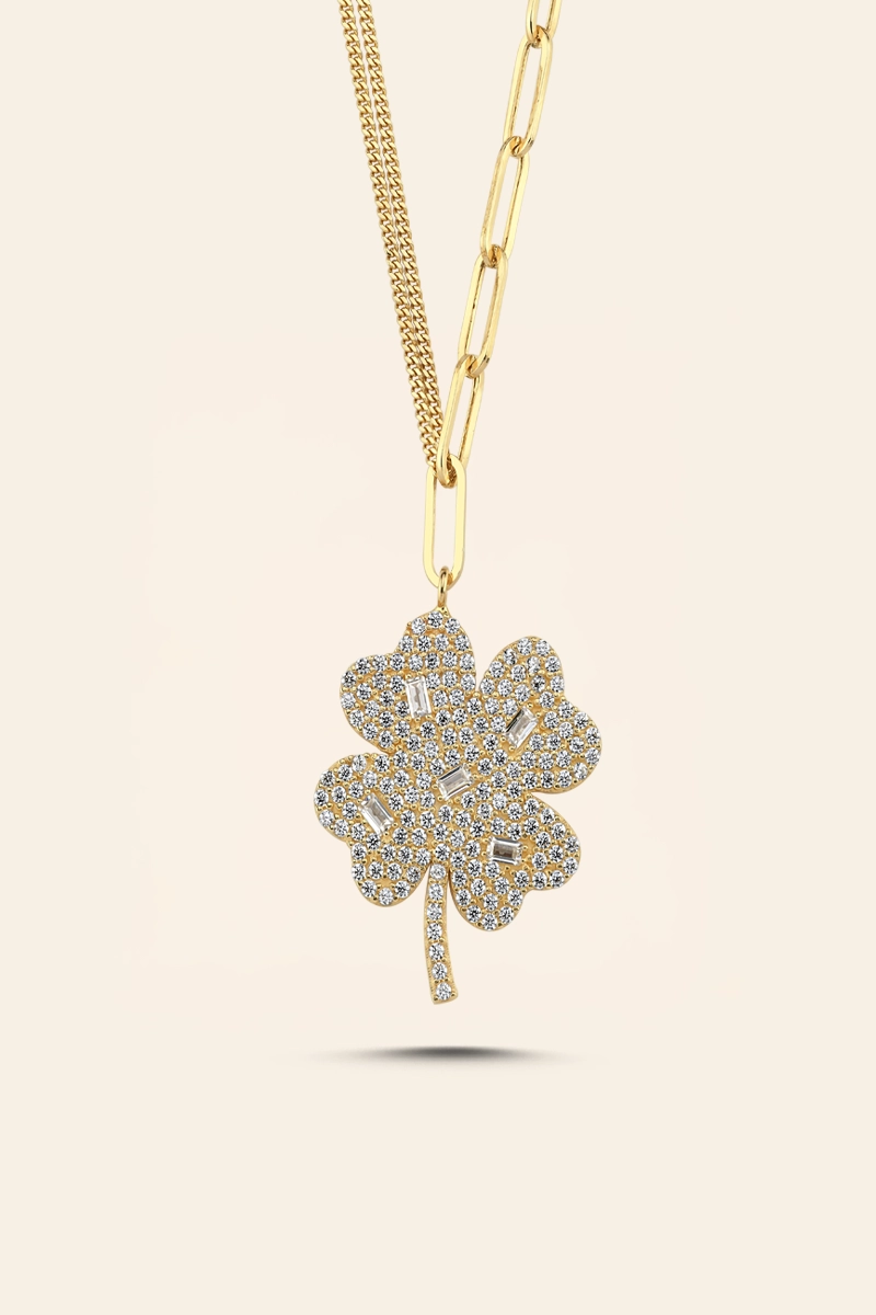 Doğanın zarafetinden ve şansın sembolü olan dört yapraklı yoncadan ilham alan bu özel tasarım, altının sıcak parıltısını zarif taş detaylarıyla bir araya getiriyor. Zincir boyunca yer alan küçük taş dokunuşları tasarıma zarif bir hareket kazandırırken, merkezdeki taşlı yonca motifi kolyenin kalbinde parlayan bir odak noktası oluşturur. Işığın her temasında pırıltısını yansıtan bu tasarım, modern çizgileriyle klasik bir zarafeti aynı anda taşır.