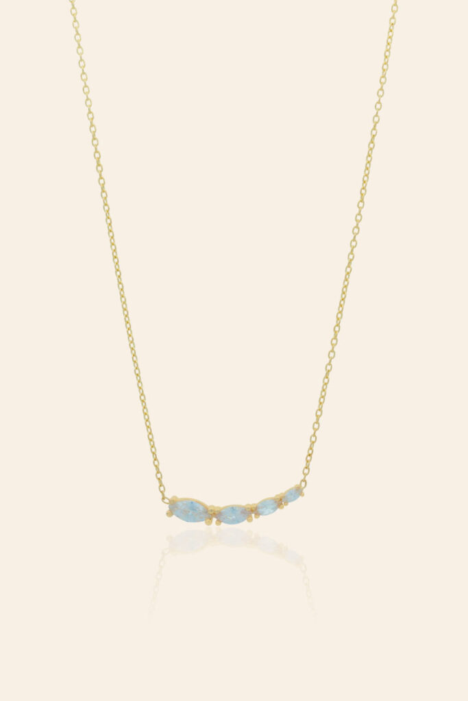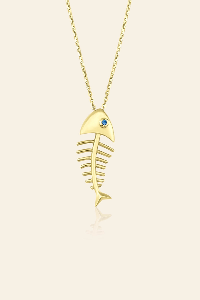 Balık formunun baş kısmında yer alan taş detayı tasarıma odak noktası kazandırırken, iskelet yapıyı oluşturan ince altın hatlar kolyeye hafiflik ve akıcılık hissi verir. Dikey form, boyun hattını zarif bir şekilde vurgular ve kolyenin tek başına güçlü bir stil ifadesi oluşturmasını sağlar.