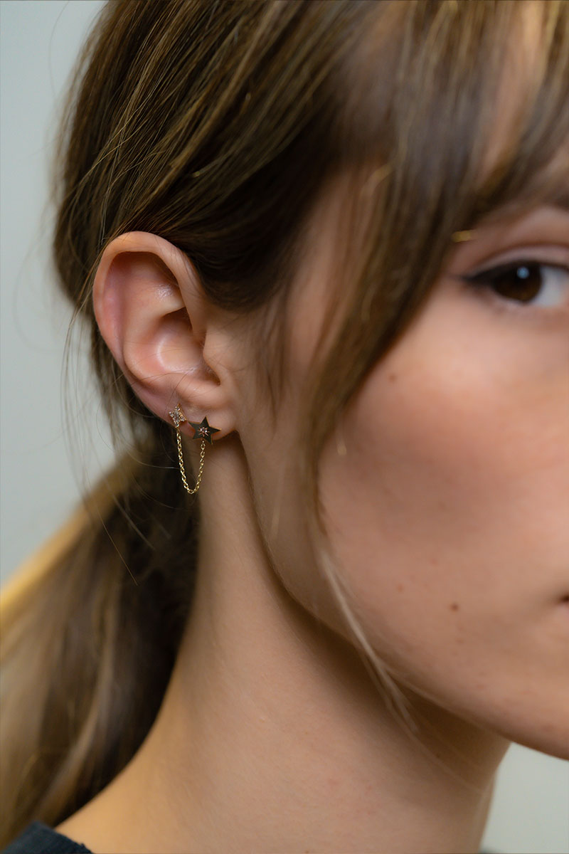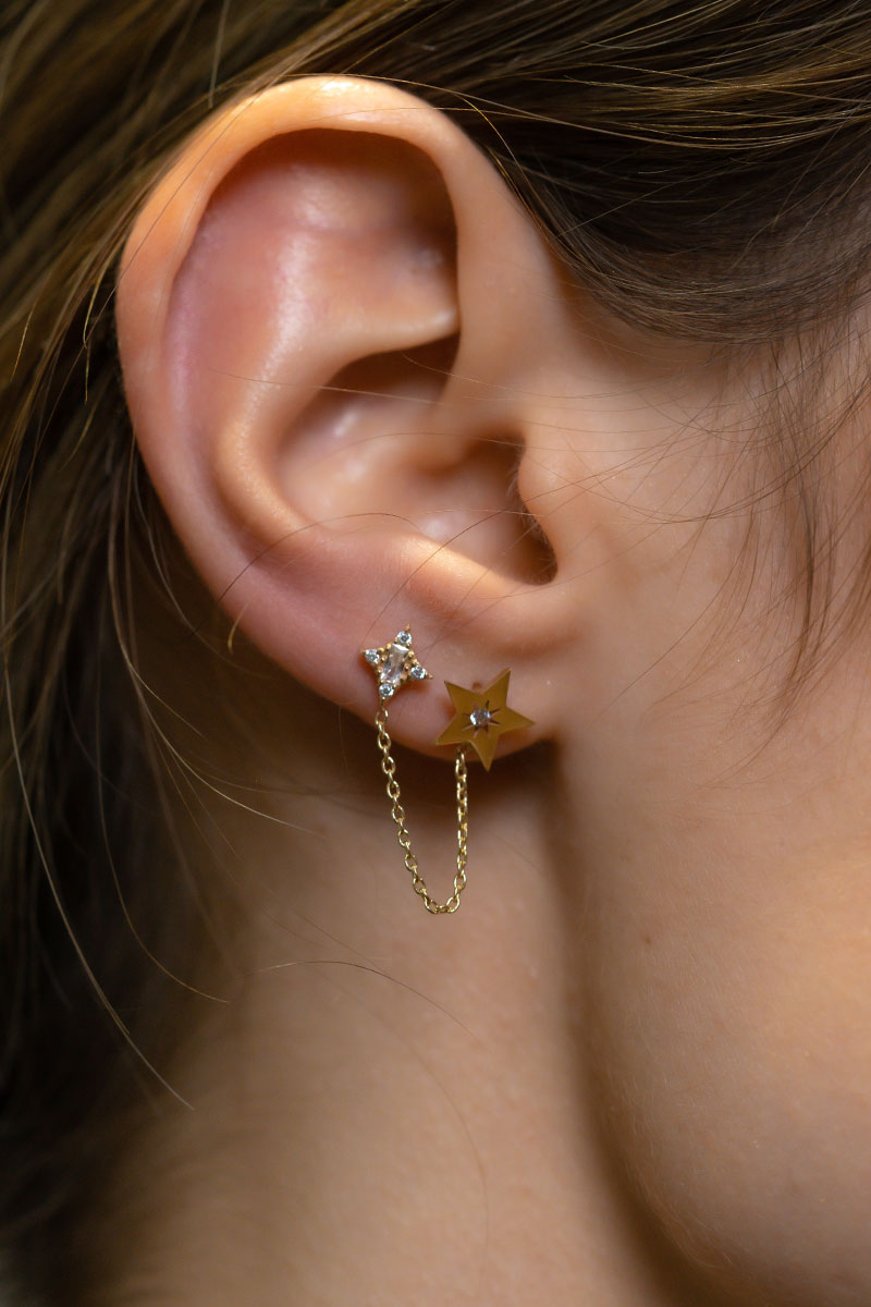 14 Ayar Sarı Altın Çift Yıldız Zincir Tek Küpe