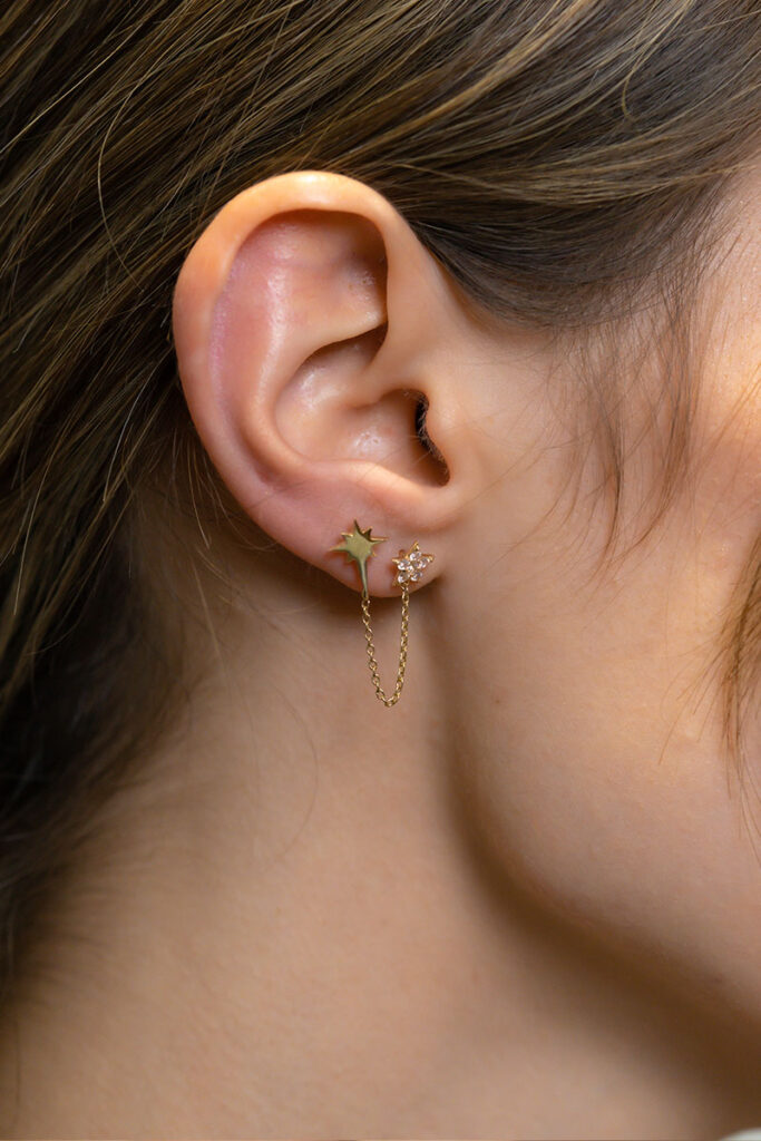 14 Ayar Sarı Altın Yıldızlı Zincir Tasarım Tek Küpe