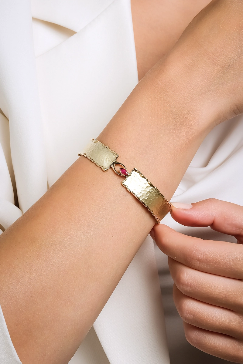 El işçiliği detayları ve modern duruşuyla öne çıkan bu bilezik, sade ama etkileyici tasarımlardan hoşlananlar için tasarlanmıştır.
