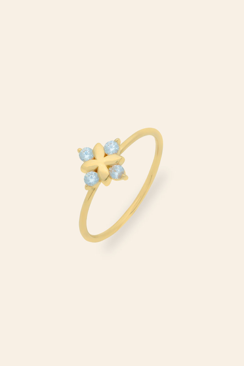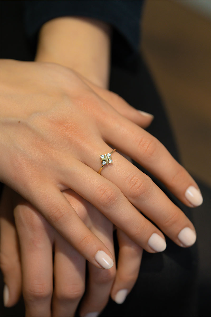 Işıltıyı ve sadeliği bir araya getiren bu altın minimal yüzük, dört taşlı zarif formu ile zarafetin en sade halini yansıtır. Parlak taşların bir çiçeği andıran dizilimi, zarif bir görünüm kazandırırken, sade halkası sayesinde her stile kolayca uyum sağlar. Minimalist tasarımıyla hem günlük kullanımda zarif bir tamamlayıcı, hem de özel davetlerde dikkat çekici bir detay olarak öne çıkar.