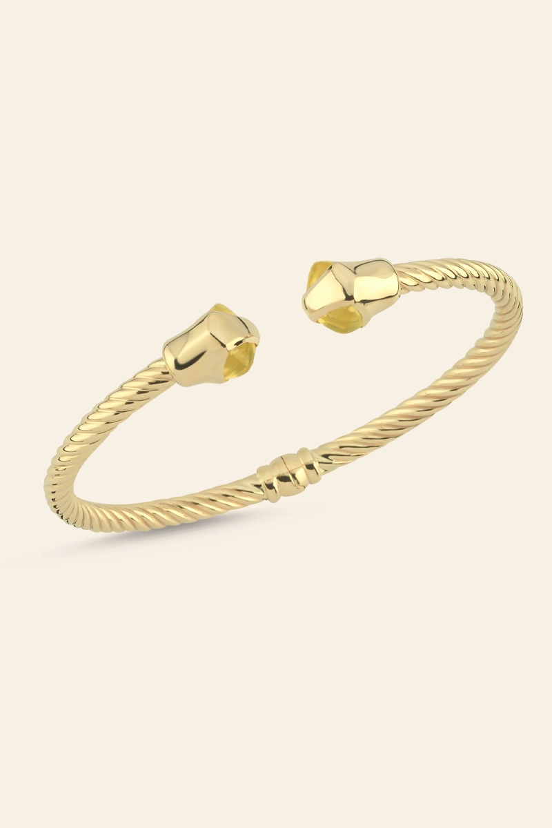 Twist Koleksiyonu’nun ikonik burgu formunu, yalın ama etkileyici bir tasarımla yeniden yorumlayan bu bilezik, minimalizmin gücünü zarafetle buluşturuyor. Parlak altın yüzeyi boyunca uzanan burgu hat, ışığı her açıdan yansıtarak bileziğe dinamik bir ışıltı kazandırır. Uç kısımlarındaki pürüzsüz form detayları ise güçlü bir karakter ve modern bir görünüm sunar.
