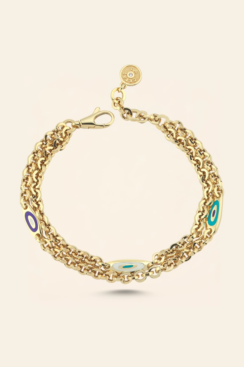 Göz temasının simgesel gücünü çağdaş bir yorumla sunan bu bileklik, hem estetik hem de anlam yüklü bir tasarım sunar. İki sıralı zincir yapısı, bileğe dolgun ve zarif bir görünüm kazandırırken; göz detayları tasarıma mistik bir derinlik ve özgün karakter katar.