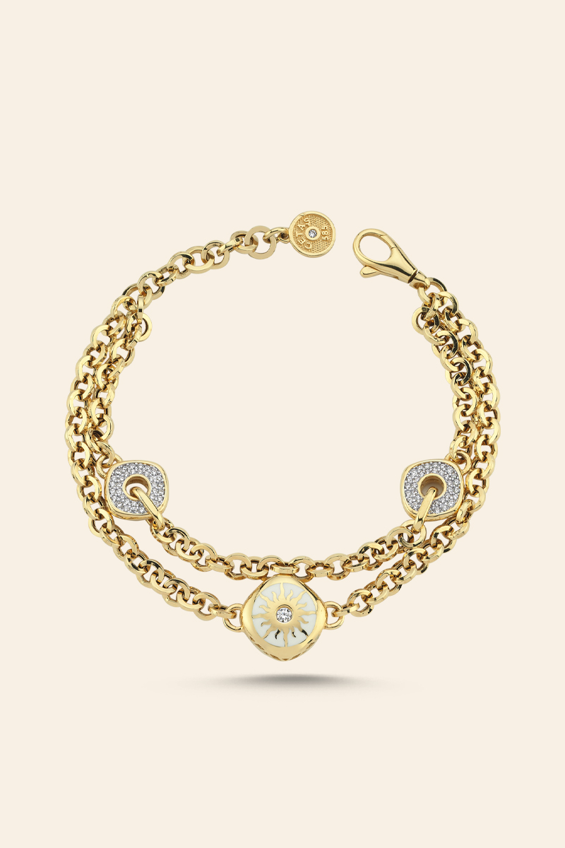 Merkezdeki güneş figürü, altın üzerine beyaz mine işçiliğiyle tamamlanmıştır. Ortasında yer alan parlak taş, tasarıma özel bir dokunuş katar. İki yanında bulunan yuvarlak halkalar, taşlı süslemeleriyle bilekliğe dengeli bir tasarım estetiği kazandırır.