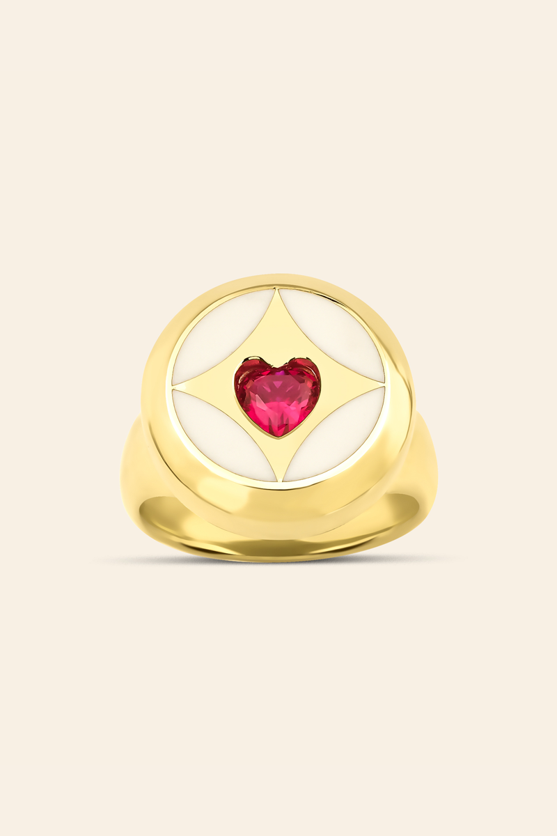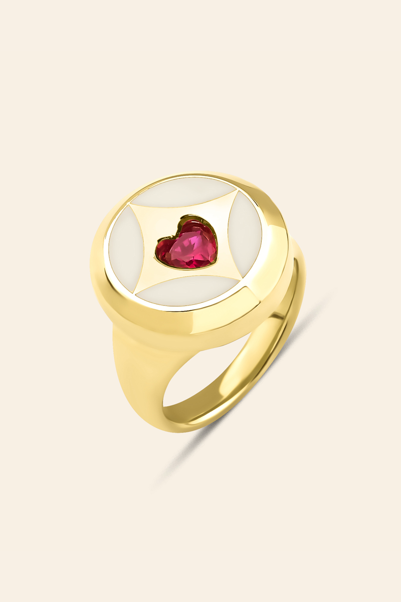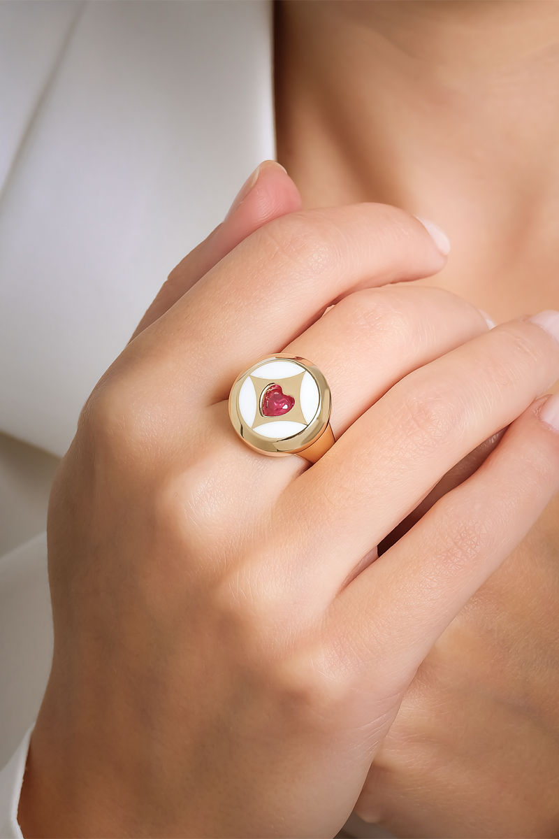 Kalp motifinin anlamını modern bir tasarım diliyle buluşturan bu yüzük, zamansız ve güçlü bir stil arayanlar için ideal bir seçimdir.