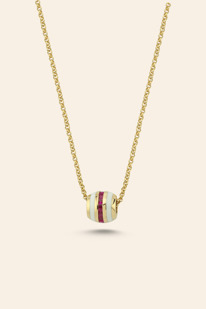 Kırmızı taş detayı, tutkuyu ve enerjiyi simgelerken; çevresini saran beyaz mine, tasarıma dengeli bir zarafet kazandırıyor. Talas Kuyumculuk’un ince el işçiliğiyle hazırlanmış bu altın mineli kolye, şık duruşuyla dikkat çeken zamansız bir mücevherdir.
