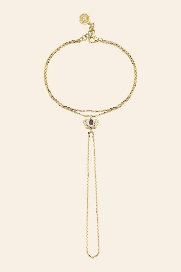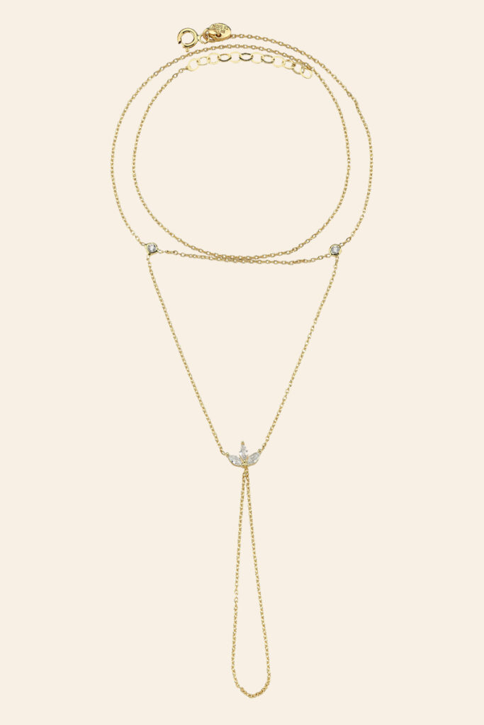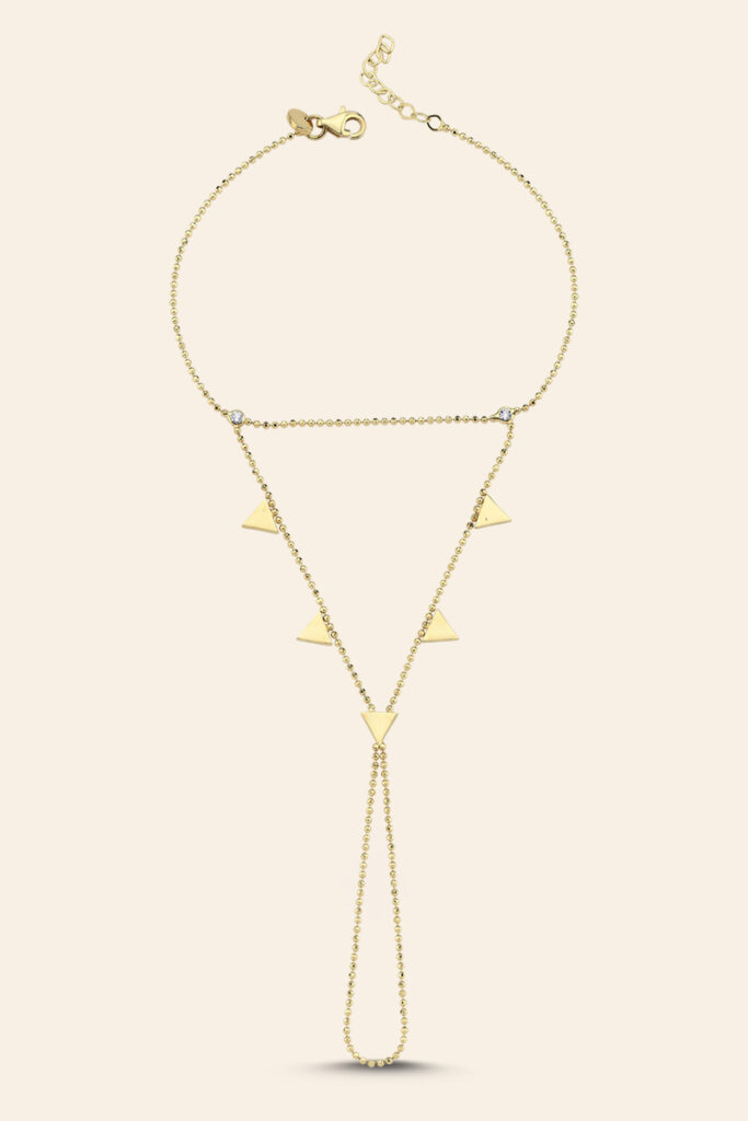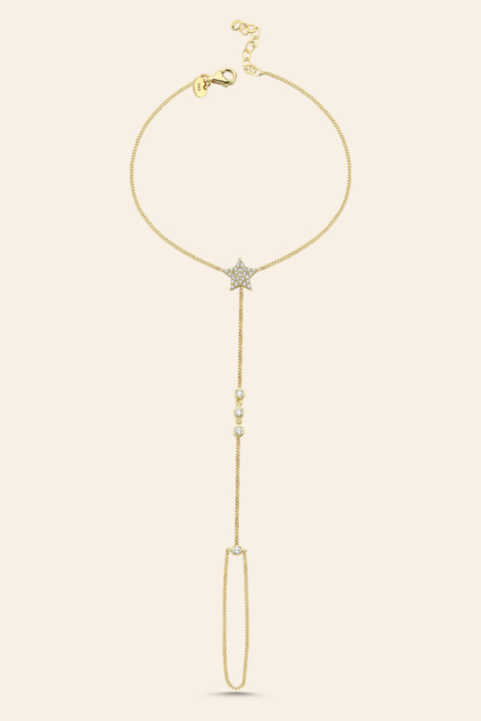 Şahmeran yapısı sayesinde bilekten ele doğru uzanan ince zincirler, tasarımın bütünlüğünü pekiştirir. Yıldız figüründen sarkan çift zincir, elin üzerinde zarif bir hat oluşturur. Bu detay, hem hareketli hem de özgün bir duruş kazandırır.
