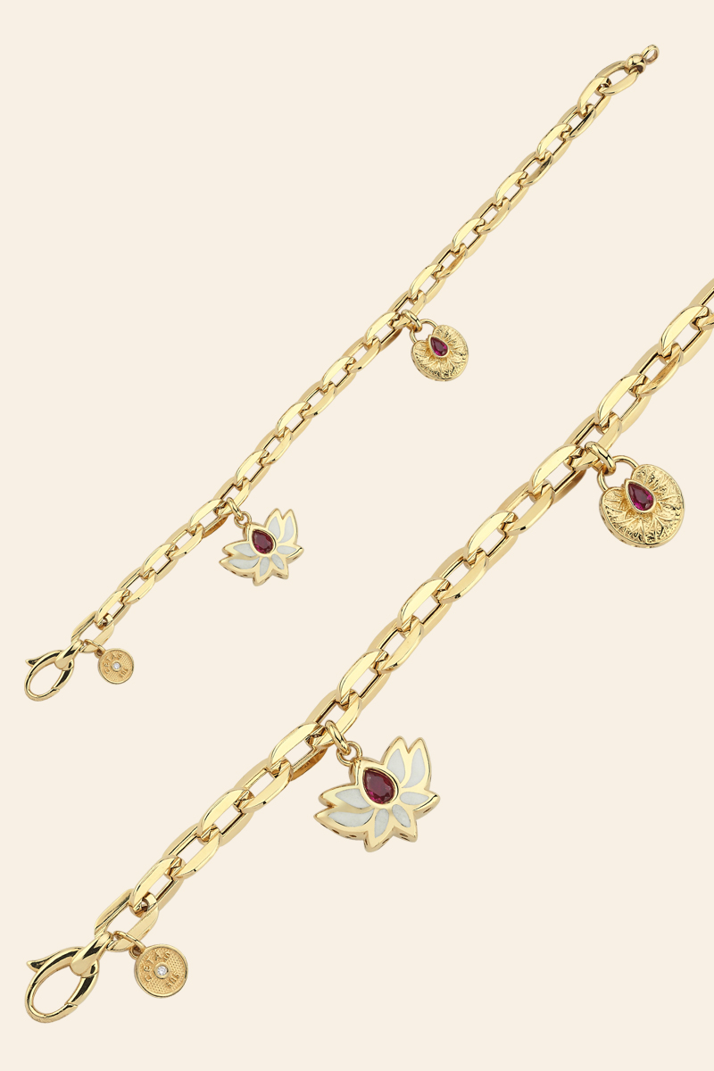 Charmların üzerinde öne çıkan beyaz mine kaplamalı lotus sembolleri, ortasında yer alan kırmızı taş ile tamamlanır. Bu taşın enerjik tonu, altının parlak rengiyle uyum içinde durarak bileğe farklı bir hava kazandırır. Lotus figürünün yanında yer alan yuvarlak detaylı charm, küçük işçiliğiyle bileziğin bütününde güçlü bir tamamlayıcı unsur haline gelir.