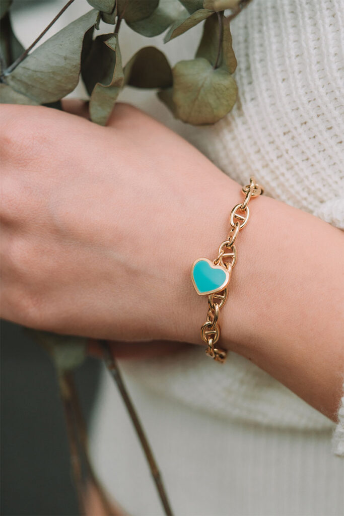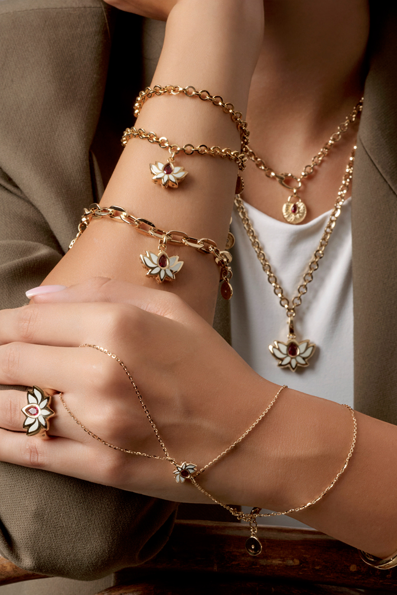 Çift zincir halkalarının birleşimi, bilekte dengeli bir görünüm oluşturur. Bu form sayesinde charm parçaları serbestçe hareket ederek farklı açılardan estetik bir etki sunar. Hem lotus ikonunun anlamını yansıtır hem de altın ile minenin birleşiminden doğan güçlü bir bütünlük sağlar.