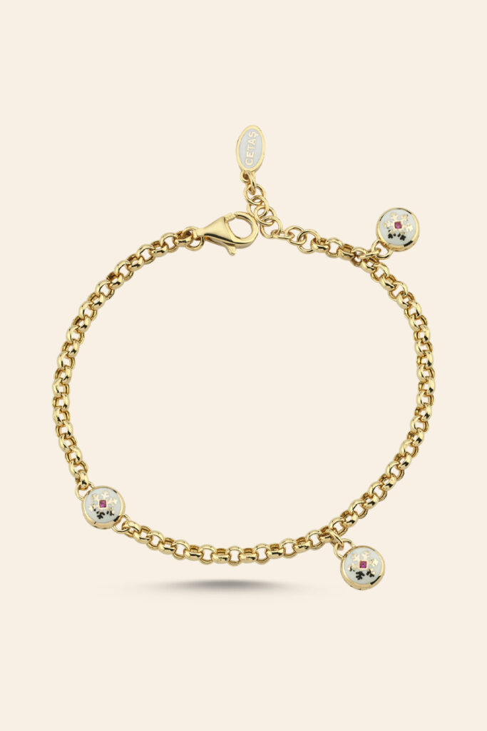 Bileklik üzerinde yer alan beyaz mine ile işlenmiş lotus figürü, ortasındaki kırmızı taş sayesinde daha da belirgin hale gelir. Lotus formunun çevresindeki altın hatlar, taşın etkisini güçlendirirken, simgesel anlamıyla bileğe farklı bir ruh katar. İkonik lotus figürünün yanında yer alan küçük yuvarlak charm detayları, tasarımı daha da zenginleştirir.