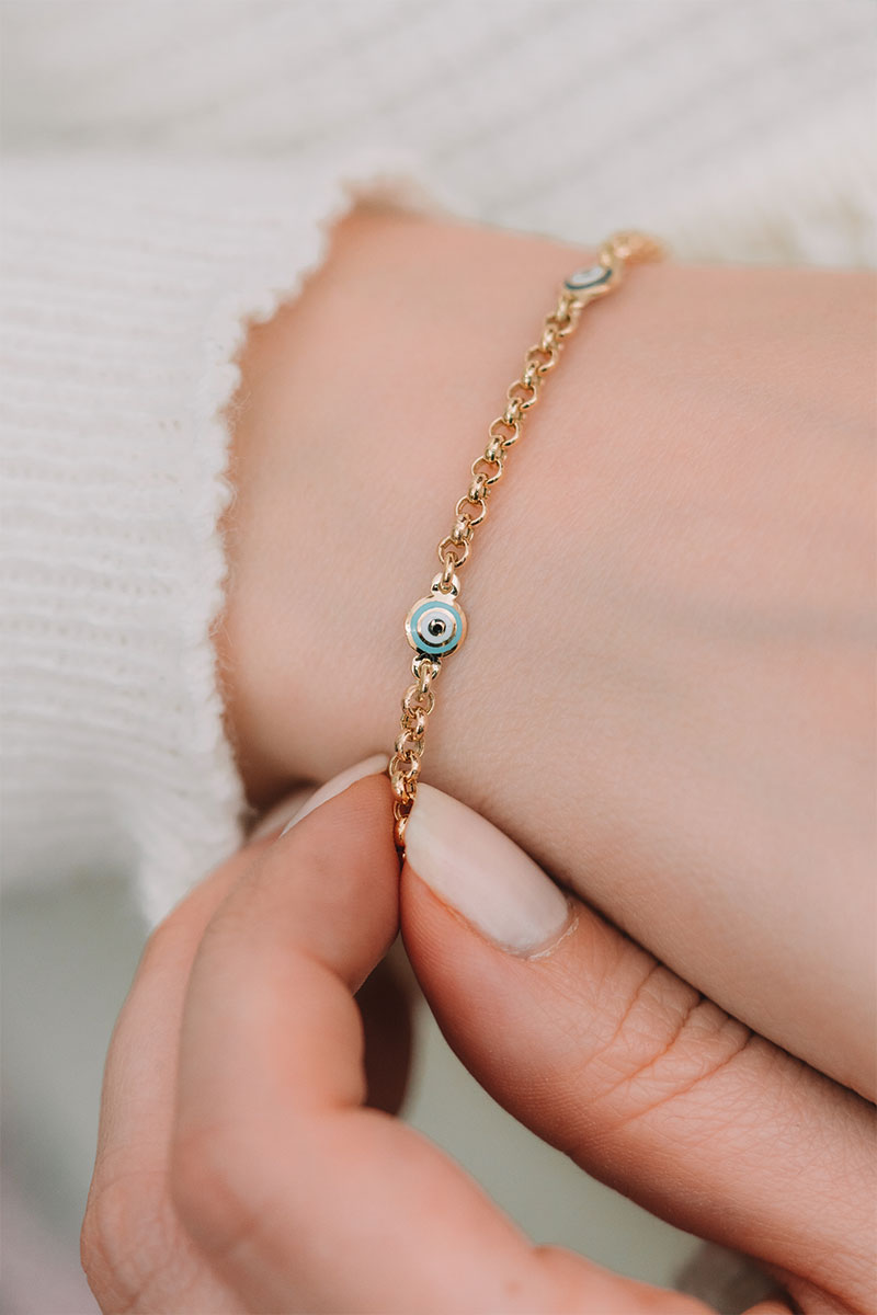Altın Nazar Boncuklu Zincir Bileklik, yetenekli ustalarımızın elinde şekillenerek sizler için özenle hazırlanmaktadır.
