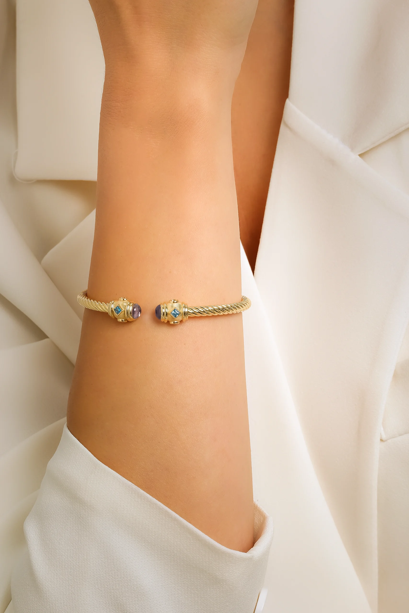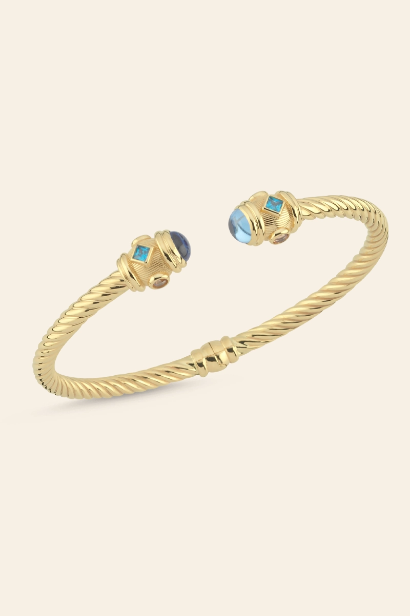 Twist Koleksiyonu’nun karakteristik burgu formunu taşıyan bu bilezik, zarafeti detaylarla güçlendiren özgün bir tasarıma sahiptir. Klasik burgu gövde, ışıltılı yüzeyiyle ışığı her açıdan yakalarken, uç kısımlarında yer alan mimari formdaki taş yuvaları bileziğe heykelsi bir görünüm kazandırır.