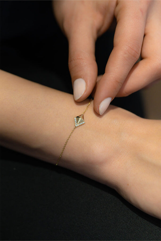 Her bir halkanın düzenli olarak birbirine bağlanması, bileğe oturduğunda dengeli bir görünüm sunar. Petek şeklindeki bağlantılar, sıradan zincir tasarımlarından ayrılarak farklı bir dokunuş kazandırır. Klasik zincir formuna yenilikçi bir bakış açısı ekleyen bu detay, tarzını yansıtmak isteyenler için özel bir tercih haline gelir.