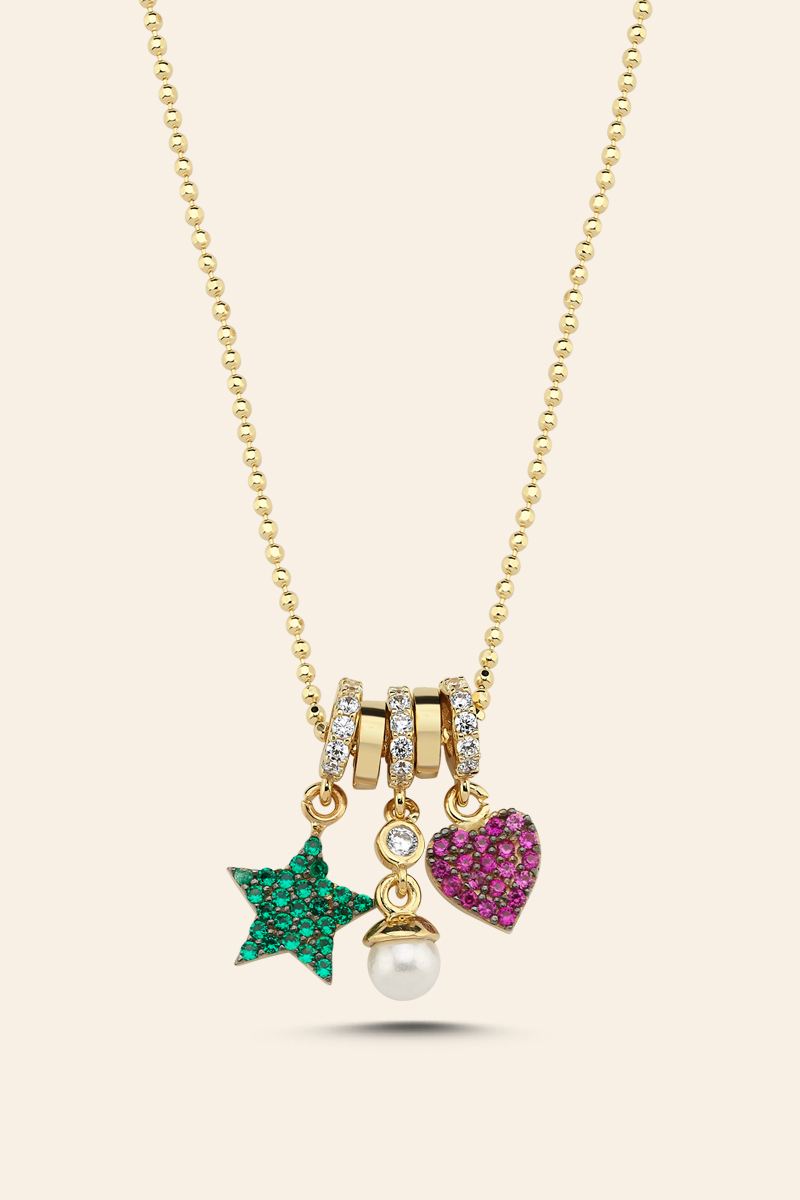 Enerjisi yüksek, eğlenceli ve zarif… Bu altın tasarım kolye, renklerin ve figürlerin uyumuyla modern takı anlayışını yeniden tanımlıyor. Altın zincir üzerine yerleştirilen taşlı yıldız, kalp ve inci detayları; neşeli bir duruşla birlikte zarafeti de ön plana çıkarıyor. Her biri özenle işlenmiş bu figürler, ışıltılı taşlarıyla birlikte göz kamaştırıcı bir bütünlük oluşturuyor.