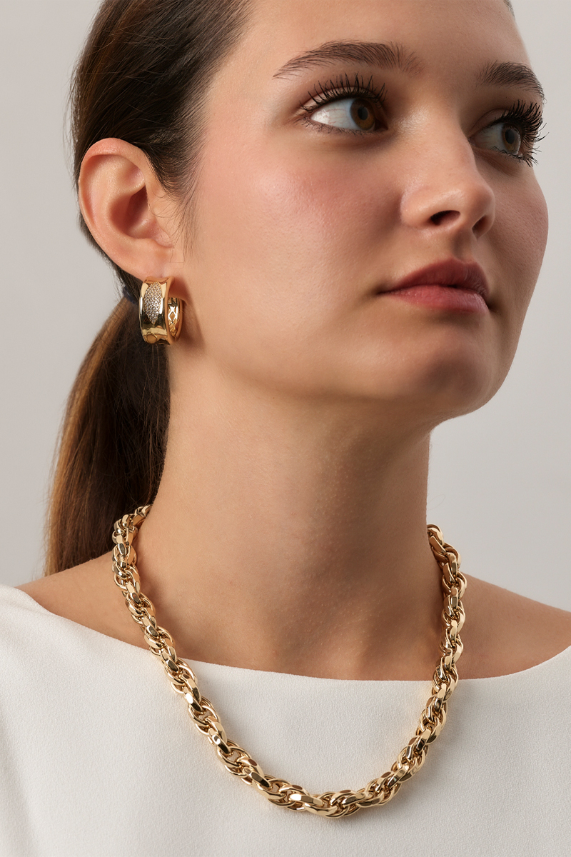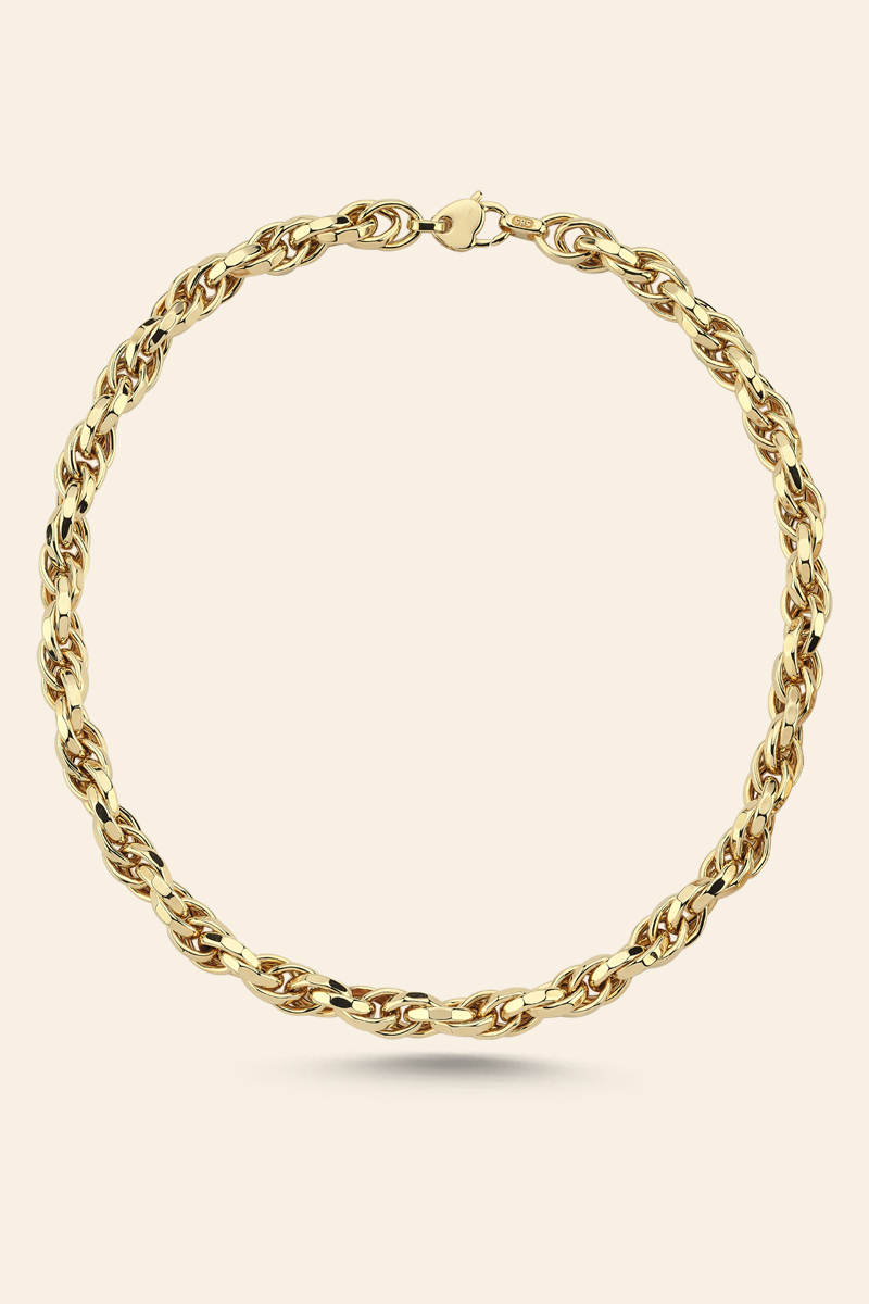 Göz alıcı bir bütünlük oluşturan bu tasarım, kalın dokulu halkaların iç içe geçmesiyle hazırlanmıştır. Spiga zincir yapısı, kıvrımlı görünümü sayesinde ışığı farklı açılardan yansıtarak dinamik bir duruş kazandırır. Günlük kullanımda olduğu kadar özel günlerde de etkili bir tamamlayıcıdır.