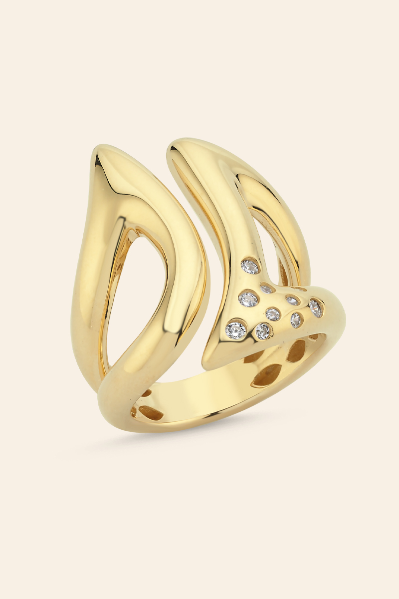 Modern tasarım anlayışının güçlü bir yansıması olan bu yüzük, dalgalı formuyla ilk bakışta fark edilir. İki ayrı parça gibi görünen kıvrımlı yapısı, parmağa yerleştirildiğinde akıcı bir bütünlük sunar. Altının parlak dokusu, yüzüğün hareketli çizgileriyle birleşerek dinamik bir görünüm oluşturur.