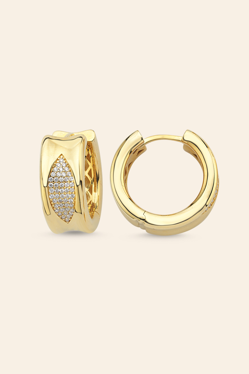 Altın takılar arasında her dönem özel bir yere sahip olan halka küpeler, modern yorumlarla yeniden şekilleniyor. Kalın formuyla öne çıkan bu tasarım, kulakta güçlü bir duruş sergiler. Parlak sarı altının etkisiyle birleşen geniş yüzey, klasik halka küpelere farklı bir boyut kazandırır.