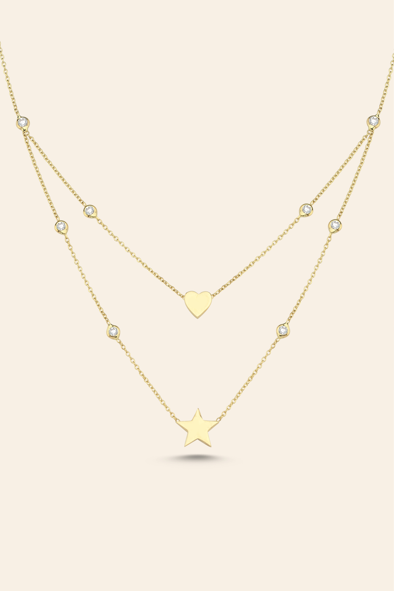 Göz alıcı sadeliğiyle dikkat çeken bu altın zincir kolye, hem yıldızın enerjisini hem de kalbin zarafetini aynı tasarımda bir araya getiriyor. Üst zincirdeki kalp motifi sevginin simgesiyken, alt zincirde yer alan yıldız figürü parlak bir ışıltıyı temsil ediyor. Zincir boyunca yerleştirilen beyaz taşlar ise altının sıcak tonuyla mükemmel bir denge kurarak her ışıkta zarif bir parıltı yaratıyor.