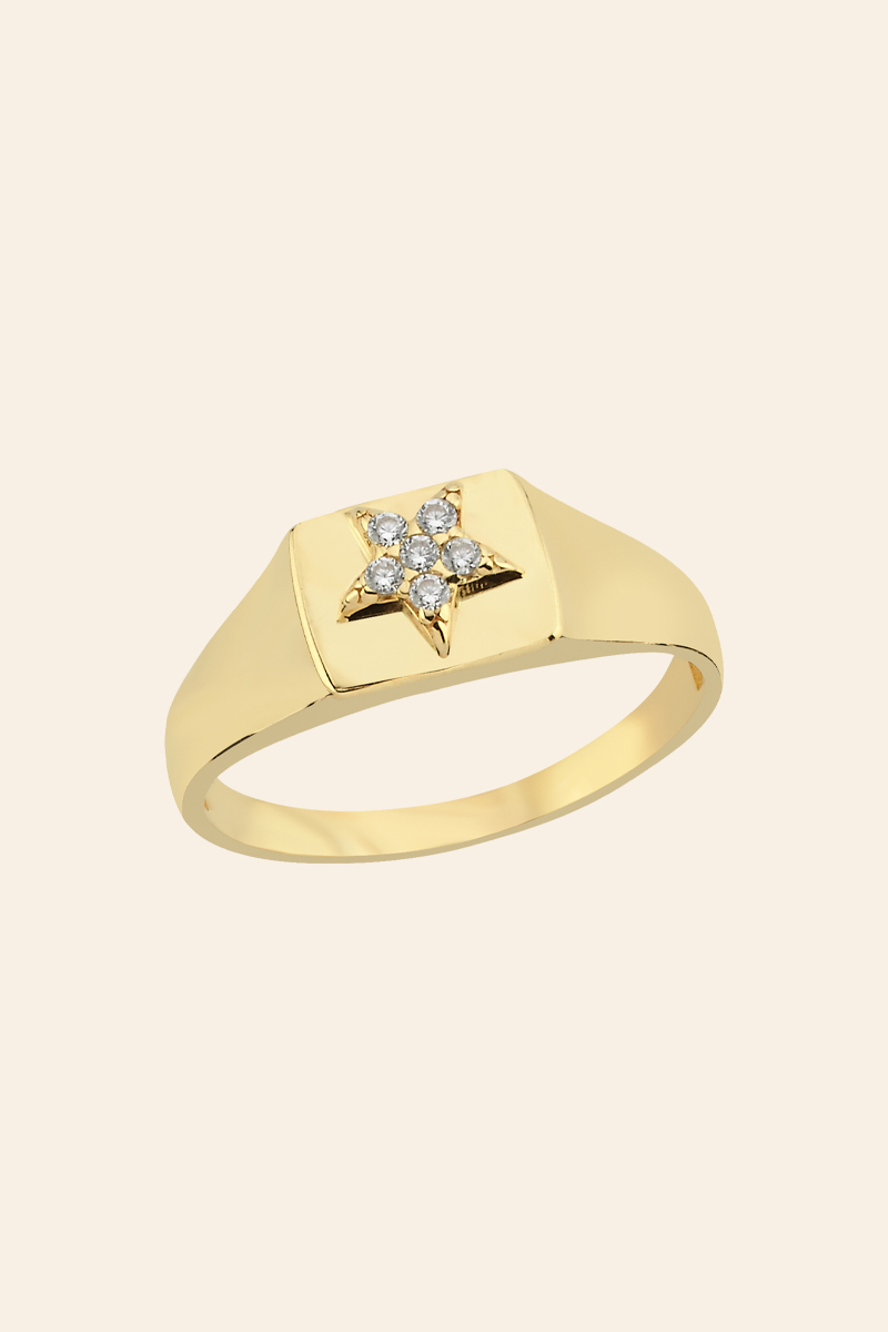 Zarafeti ve modern çizgileri bir araya getiren bu altın tasarım yüzük, yıldız formundaki taşlı yüzeyiyle dikkat çeker. Altının sıcak ışıltısı ile taşların parlaklığı, tasarıma hem zarif hem de çarpıcı bir karakter kazandırır. Gündelik kullanımdan özel davetlere kadar her stile uyum sağlayabilen bu model, sade görünümünün ardında güçlü bir estetik taşır. Işığın yansımasına göre farklı tonlar kazanan yüzey, parmakta hafif ve zarif bir duruş sergiler.