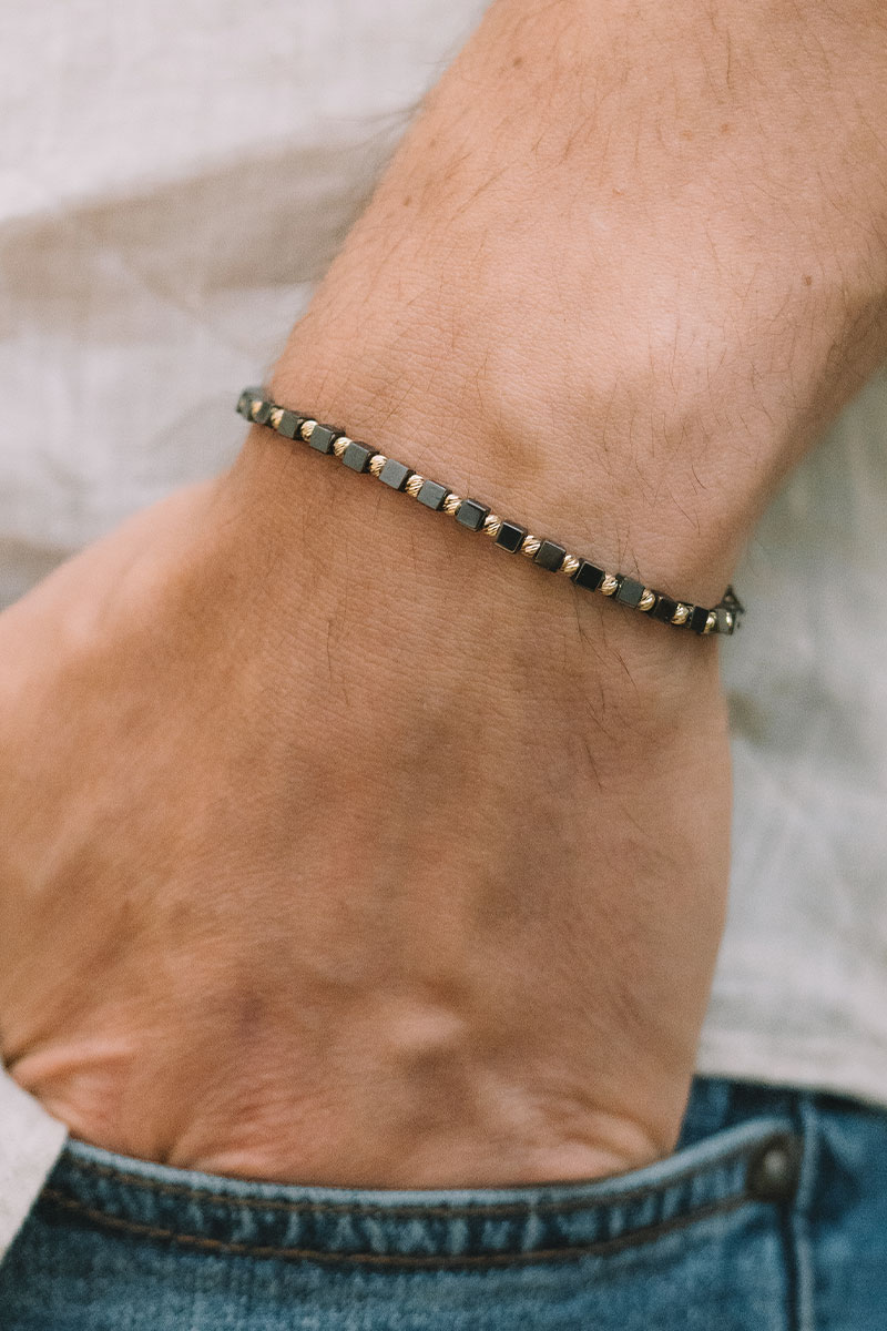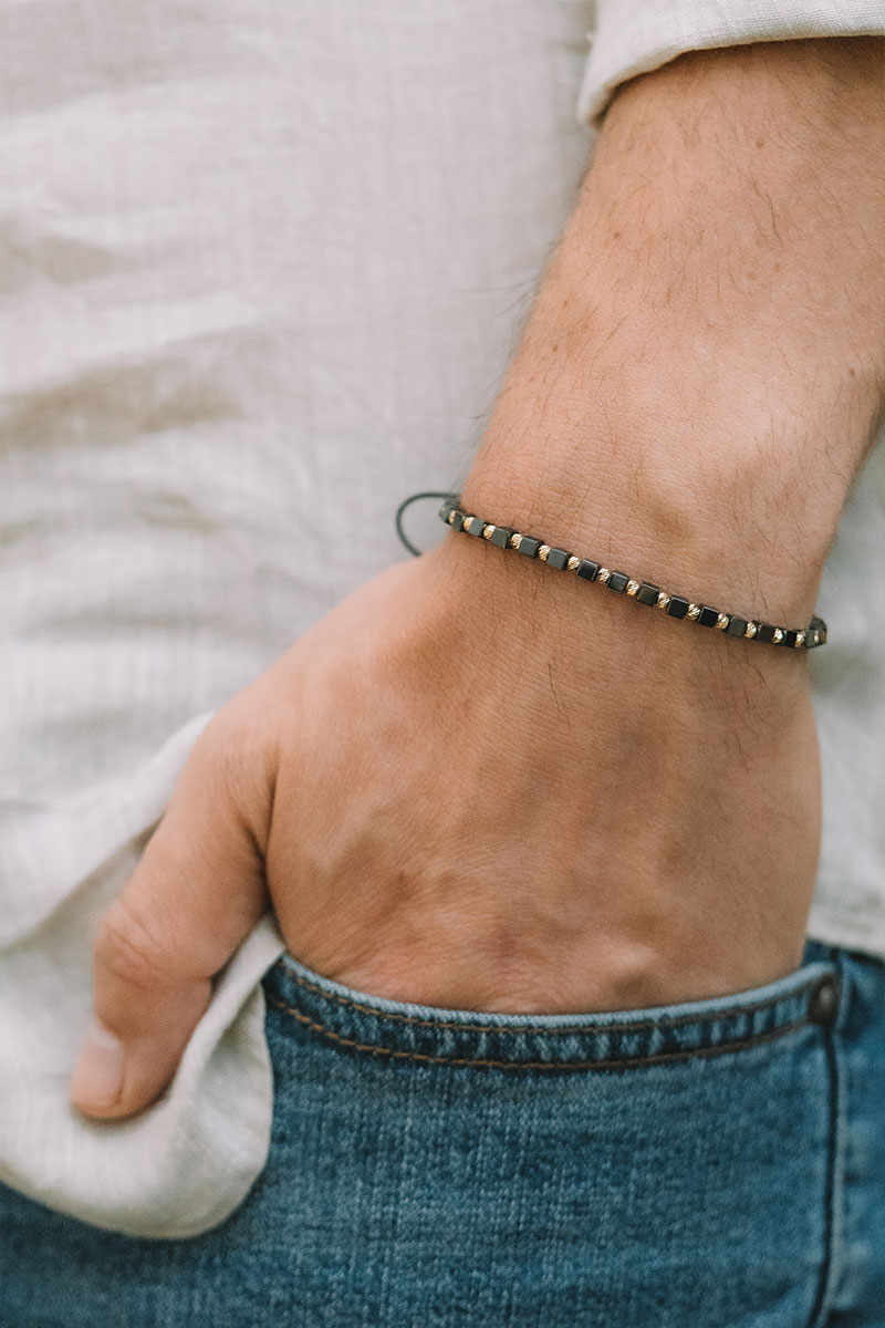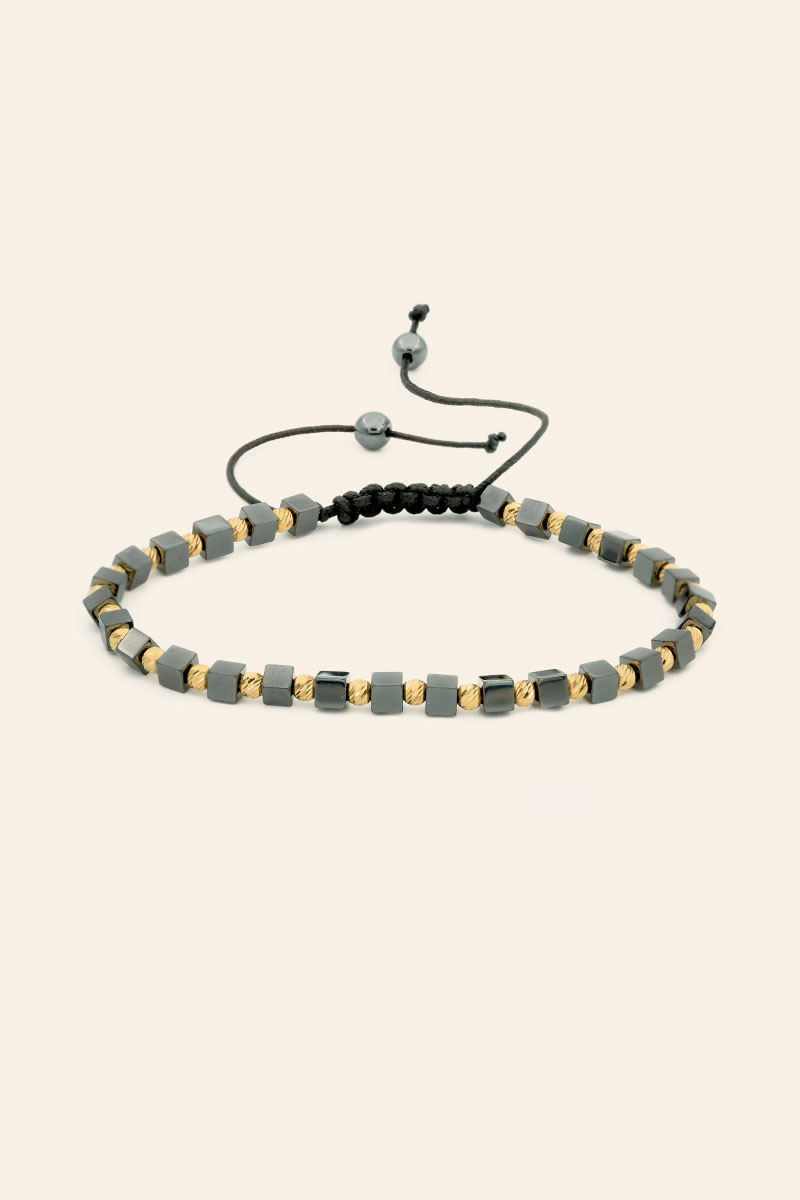 14 Ayar Sarı Altın Toplu Hematit Taşlı İpli Erkek Bileklik