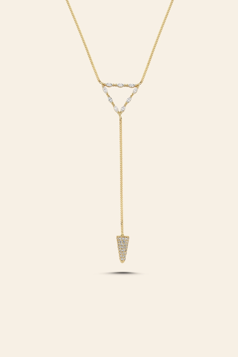 14 Ayar Sarı Altın Üçgen Formlu Uzun Taşlı Kolye ile Modern Işıltının Gücünü Keşfedin