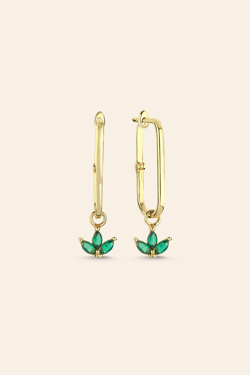 Çiçek figürü, doğallığı ve yenilenmeyi simgelerken yeşil taşların enerjik tonu tasarıma ferah bir karakter kazandırır. Uzun ve zarif halka formu sayesinde kulakta estetik bir duruş sergileyen bu küpe modeli, yüz hatlarını yumuşak bir şekilde vurgular. Günlük kombinlerde rahatlıkla kullanılabileceği gibi, sade elbiselerle bir araya getirildiğinde özel davetlerde de şıklığınızı tamamlayan zarif bir aksesuar haline gelir.