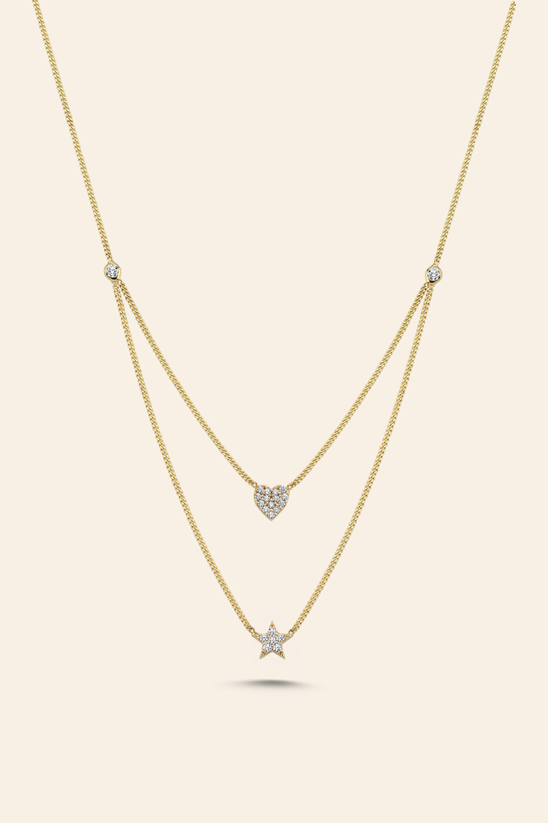 3,26 gram ağırlığındaki bu altın minimal kolye, hafif yapısıyla gün boyu konfor sunarken, çift sıralı formu sayesinde boyun hattına zarif bir hareket kazandırır. Kalp figürü sevgi ve bağlılığı, yıldız figürü ise özgürlük ve umut duygusunu temsil eder. Günlük kullanımda sade bir şıklık sağlarken, özel anlarda göz alıcı bir tamamlayıcı hâline gelir.