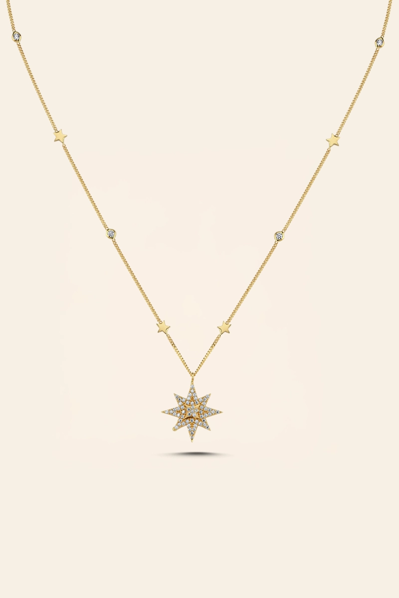 Gökyüzünün büyüsünden ilham alan bu zarif kolye, yıldızın ışığını ve altının sıcak tonunu bir araya getiriyor. İnce zincir üzerinde yer alan yıldız ve pırlanta ışıltısındaki taş detayları, tasarıma zarif bir ritim kazandırırken, merkezdeki sekiz kollu yıldız formu dikkat çekici bir odak noktası oluşturur. Işığın her temasında yüzeyinde dans eden parıltılar, modern bir zarafetle klasik estetiği buluşturur.