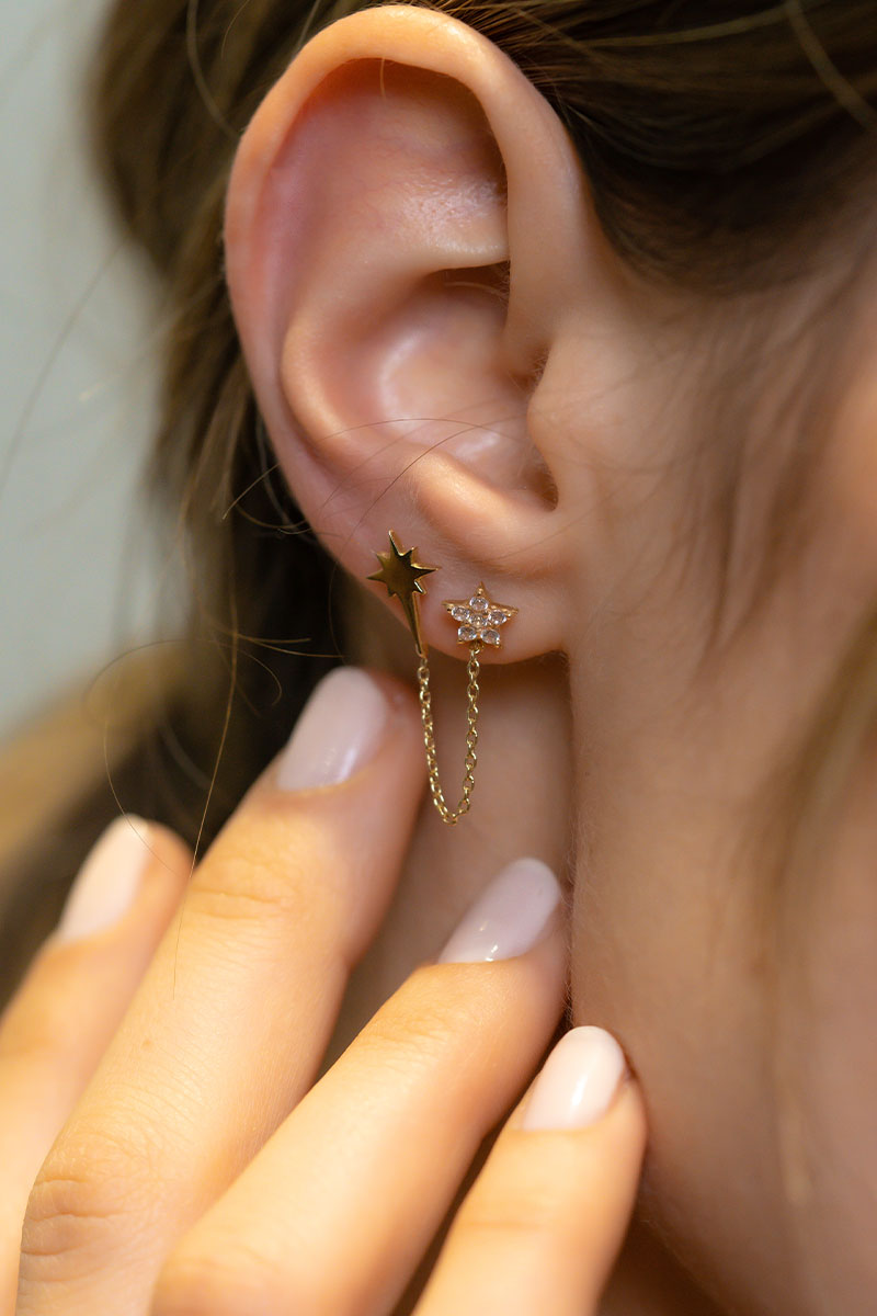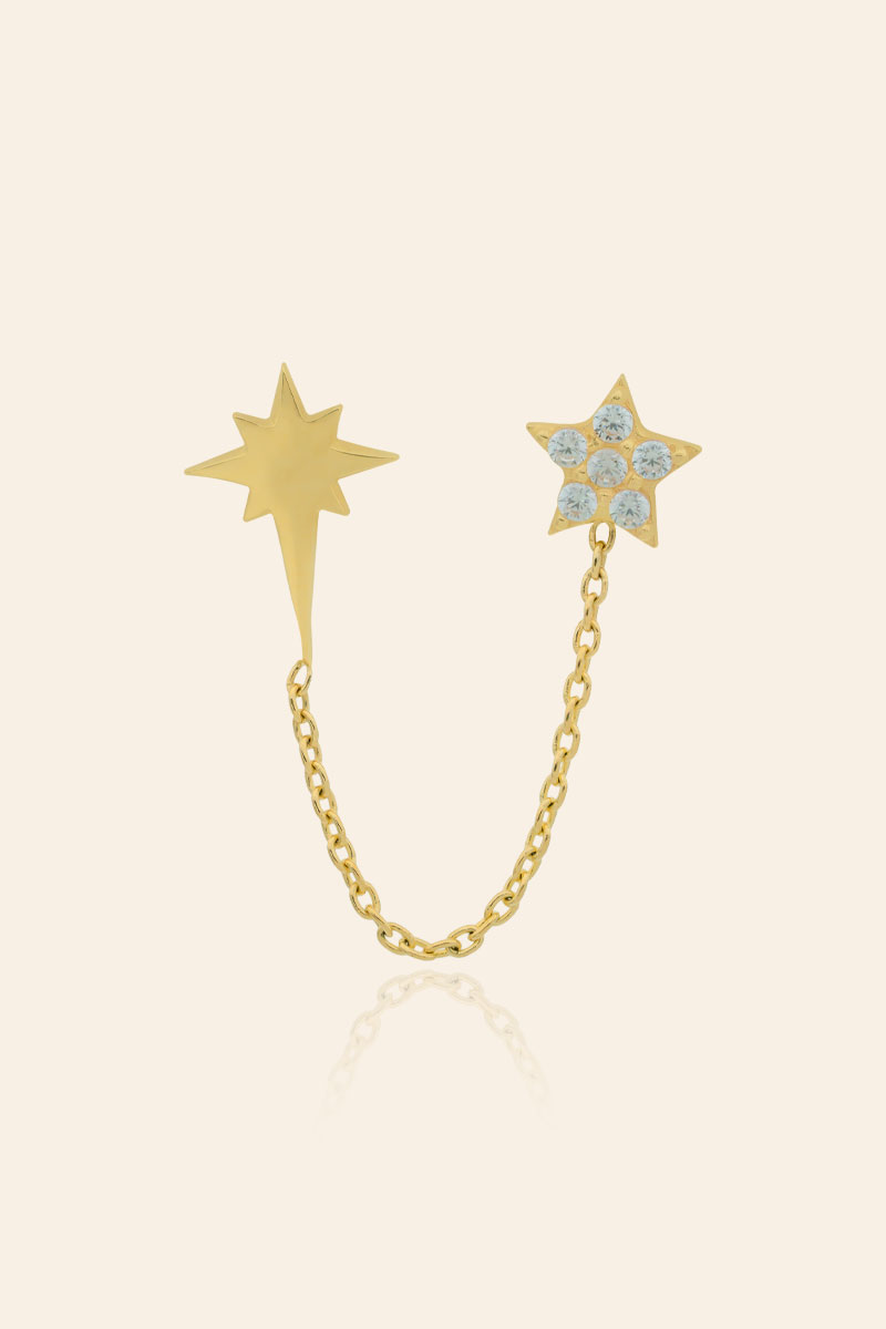 14 Ayar Sarı Altın Yıldızlı Zincir Tek Küpe