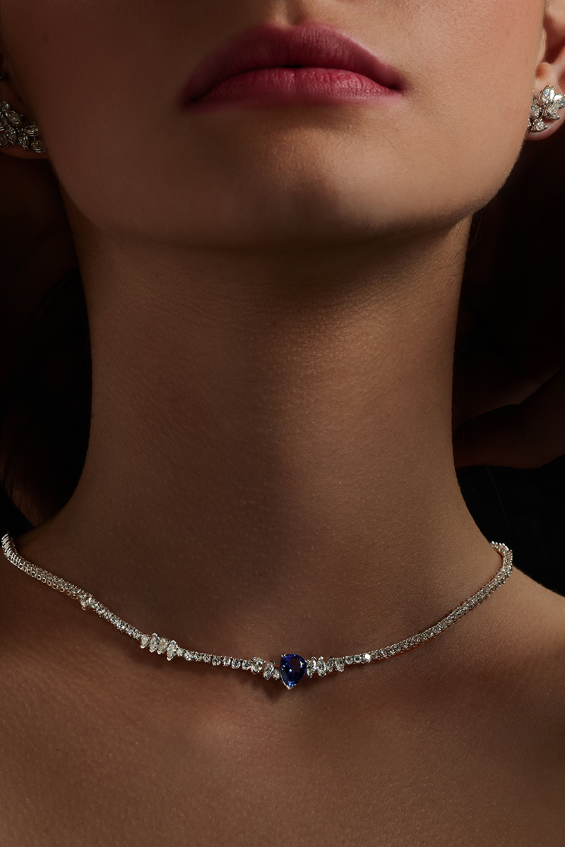 Talas Kuyumculuk koleksiyonunda yer alan bu model, özellikle pırlantanın berraklığını ön plana çıkaran ince işçilikle hazırlanmıştır. Her bir pırlanta taş, ışığı en yüksek seviyede yansıtacak şekilde ustalıkla işlenmiş ve mükemmel bir akış oluşturacak biçimde dizilmiştir. Tasarımın merkezinde yer alan damla kesim taş ise kolyeye benzersiz bir karakter ve seçkinlik kazandırır.