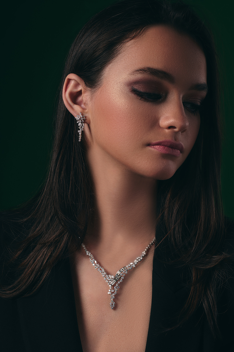 Her biri özenle seçilmiş 116 adet pırlanta, kolyenin formuna kusursuz bir şekilde yerleştirilmiş olup boyun hattında akıcı bir parlaklık yaratır. Tasarımın merkezindeki sofistike birleşim noktası, mücevherin karakterini güçlendirirken ışığı her açıdan kusursuz biçimde yansıtır.