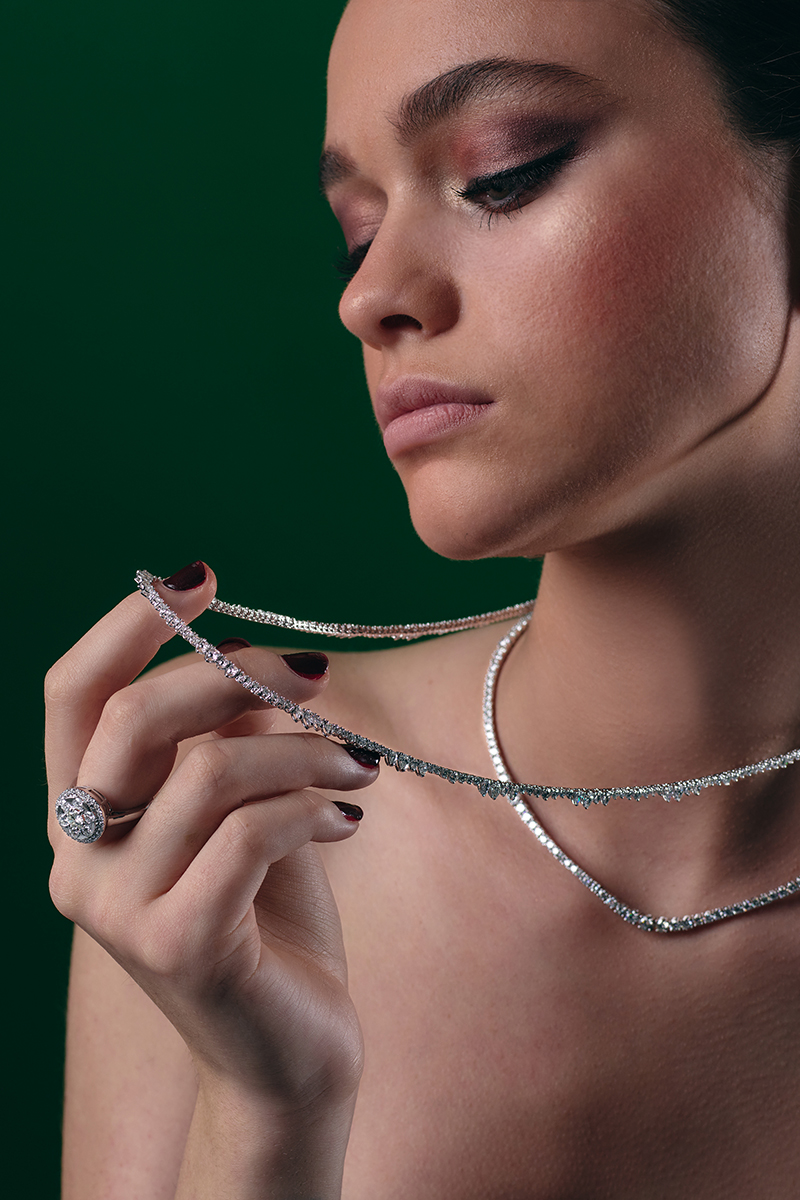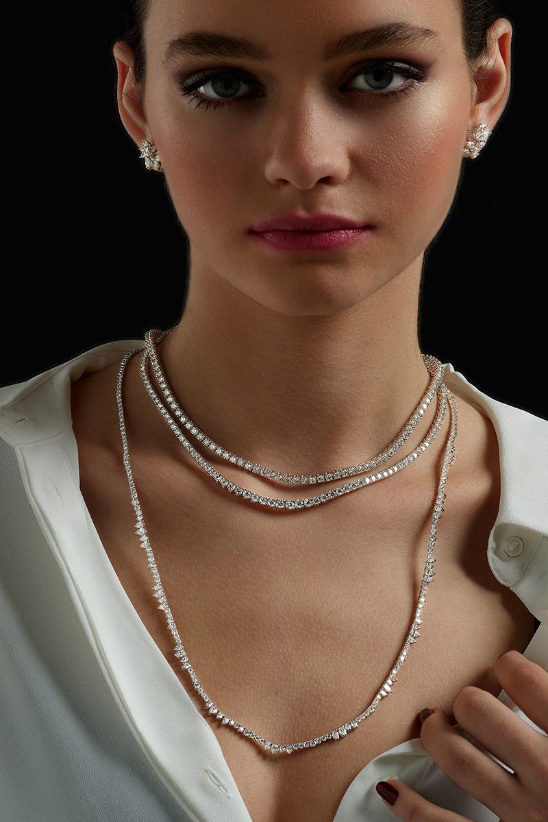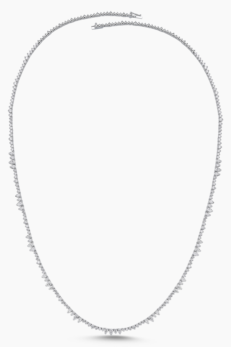 Toplam 44 adet 3,96 ct damla pırlanta ve 136 adet 5,90 ct pırlanta ile bezenmiş olan pırlanta kolye, ışığı her açıdan yakalayan taş kesimleri sayesinde büyüleyici bir ışıltı sunar. Damla formundaki taşların ritmik dizilimi, modele hem modern hem de klasik bir duruş kazandırırken su yolu tasarımı, zarafeti kesintisiz bir çizgi hâline getirir.
