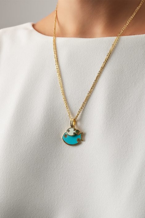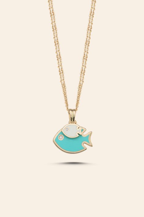 14 Ayar Sarı Altın Turkuvaz Mineli Balık Kolye