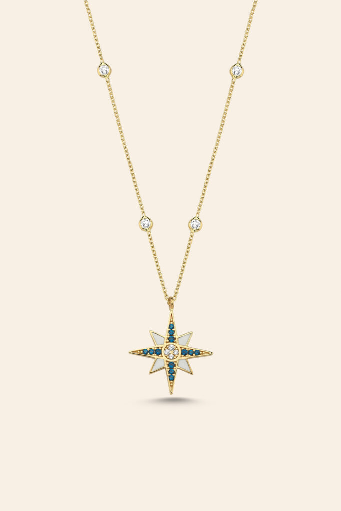 14 Ayar Sarı Altın Mineli Taşlı Kutup Yıldızı Kolye