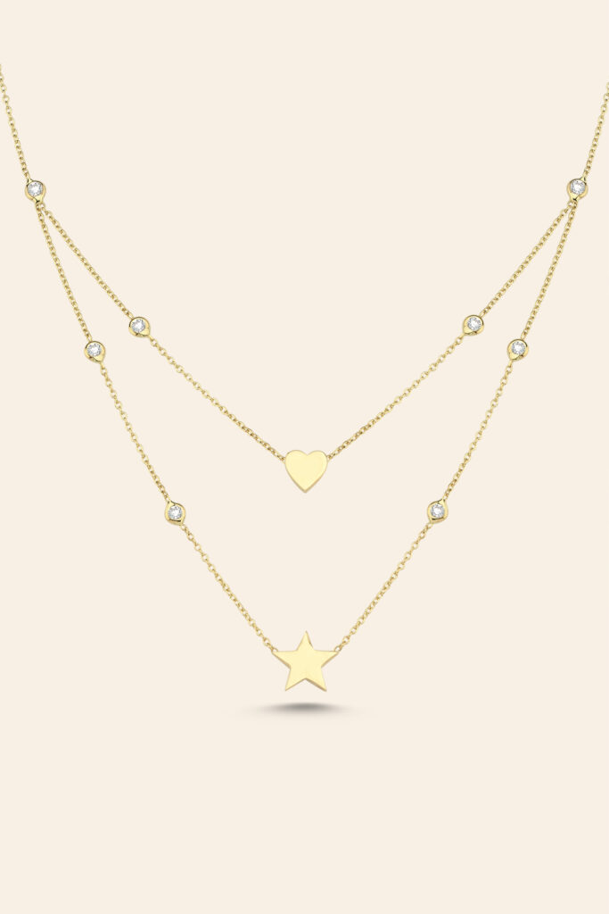 14 Ayar Sarı Altın Taşlı Yıldız Kalp Figürlü Tasarım Kolye