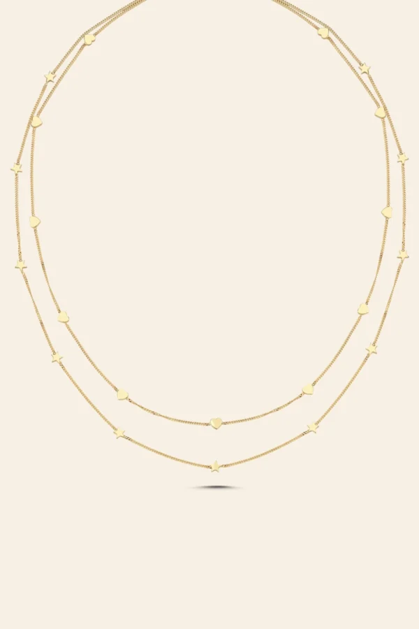 14 Ayar Sarı Altın Çift Sıra Yıldız ve Kalp Detaylı Kolye