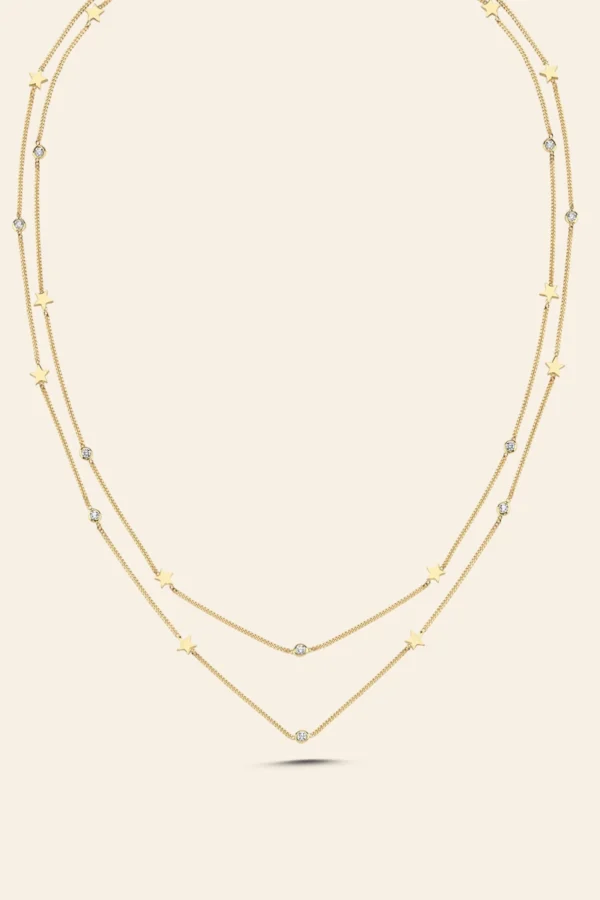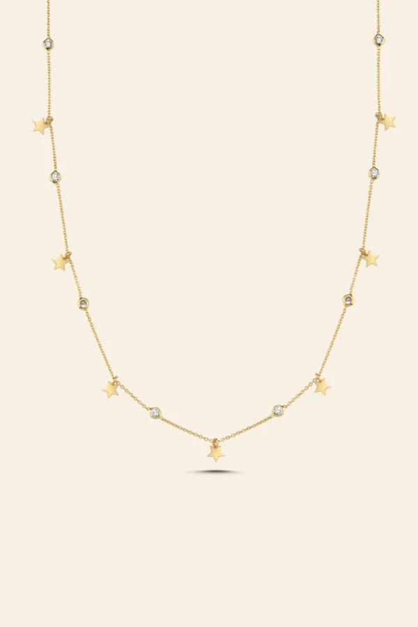 14 Ayar Sarı Altın Çift Sıra Yıldız ve Taş Detaylı Kolye