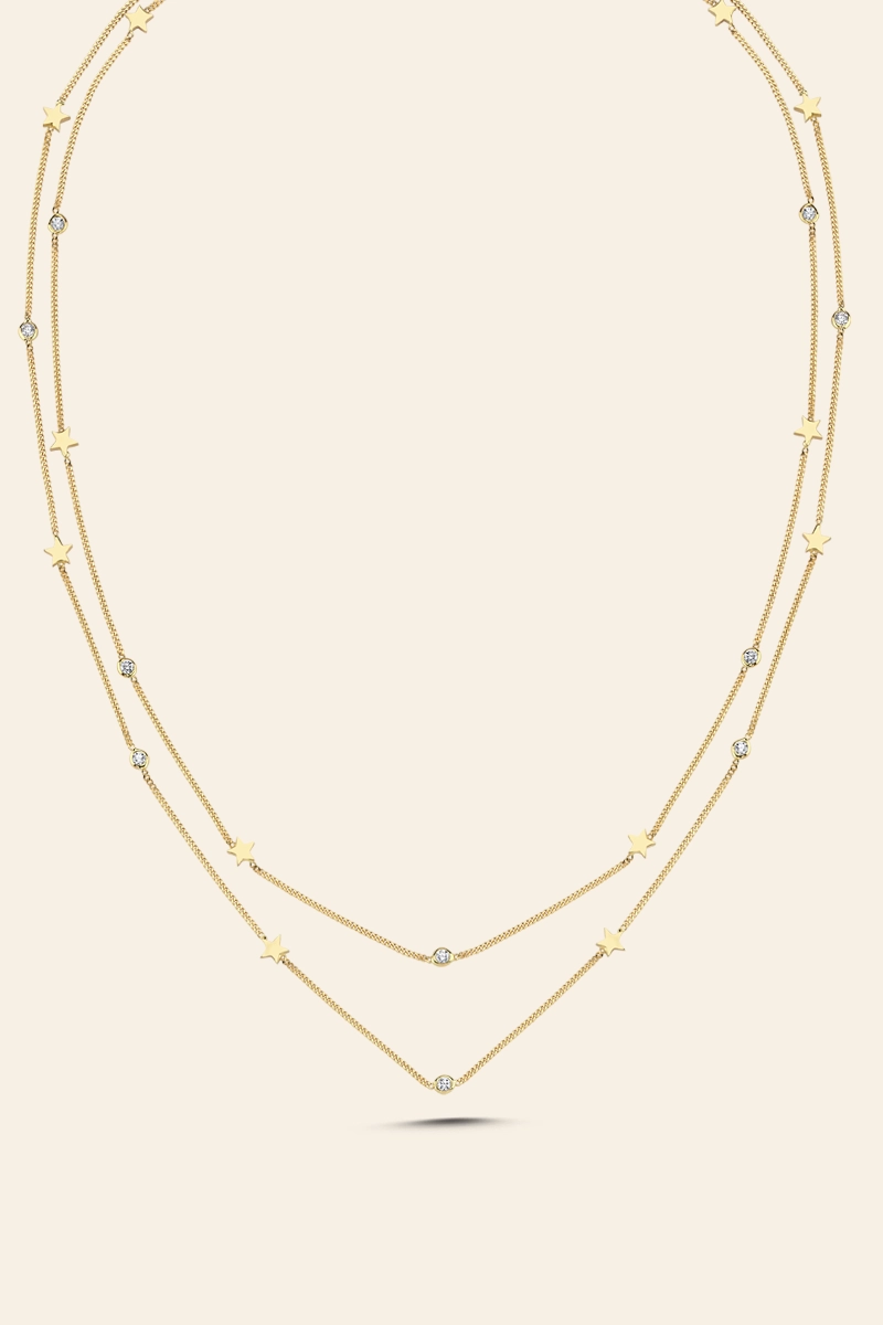 14 Ayar Sarı Altın Çift Sıra Yıldız ve Taş Detaylı Kolye