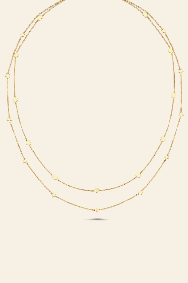 14 Ayar Sarı Altın Çift Sıra Yıldız ve Kalp Detaylı Kolye
