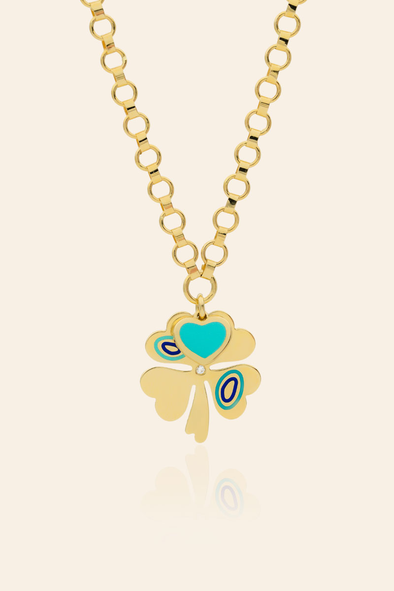 14 Ayar Sarı Altın Mineli Yonca ve Kalp Figürlü Taşlı Kolye