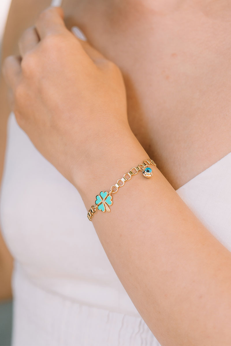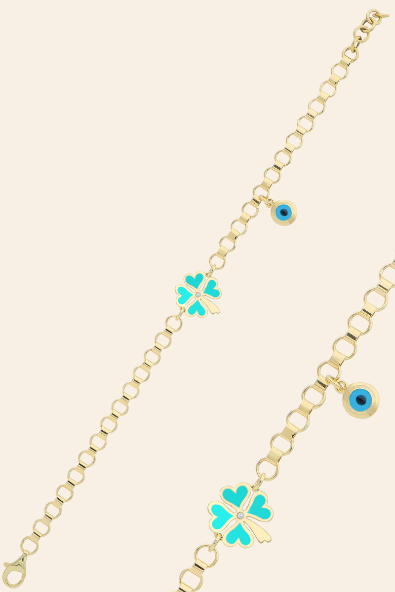 14 Ayar Sarı Altın Mineli Yonca Figürlü Nazar Boncuklu Bileklik