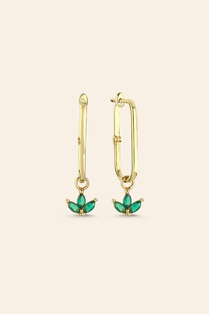 14 Ayar Sarı Altın Yeşil Taşlı Çiçek Tasarım Küpe